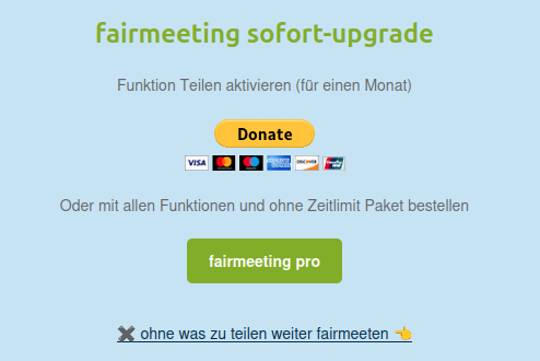 Mit dem Sofort-Upgrade wird die Bildschirmfreigabe für 30 Tage aktiviert und es erscheint auch kein Pop-up mehr, das alle 50 Minuten um eine Spende bittet 🕐. Wer ein fairmeeting pro Paket abonniert, erhält alle Funktionen, ohne angebettelt zu werden 😉.