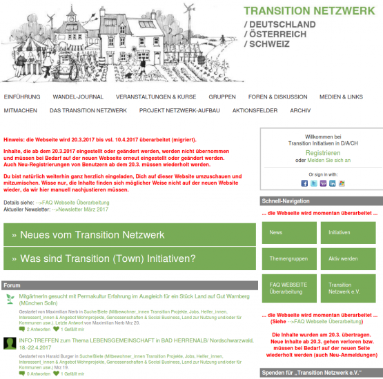 Bisher war transition-initiativen.de auf Ning gehostet. J aus München hat in enger Zusammenarbeit mit uns ein Migrationswerkzeug geschrieben, sodass wir praktisch alle Inhalte auf eine Drupal Instanz übernehmen können. Jetzt werden noch die Inhalte angepasst und aufgefrischt. Voraussichtlich Ende Mai 2017 geht die neue Seite mit Designelementen von Transition U.K. online.